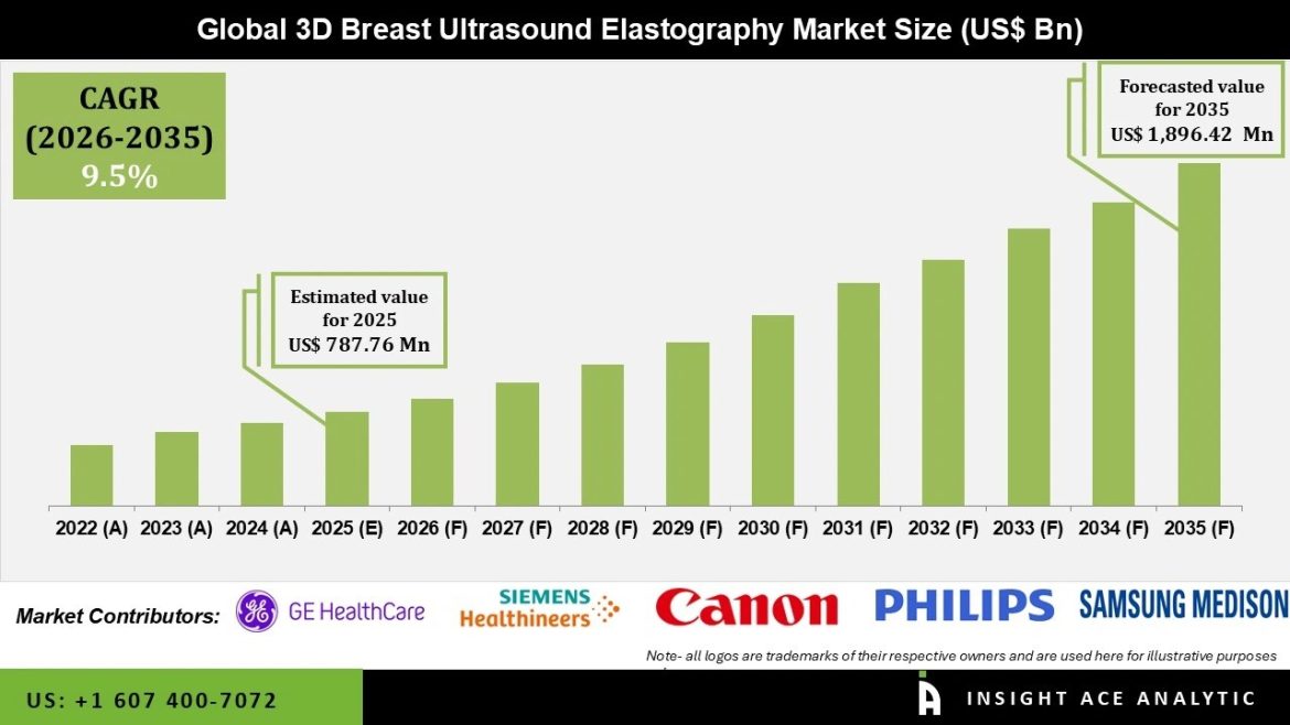 InsightAce Analytic Pvt. Ltd. announces the release of a market assessment report on the “Global 3D Breast Ultrasound Elastography Market Size, Share & Trends Analysis Report By Modality (Handheld Ultrasound Systems, Automated Breast Ultrasound (ABUS), and Hybrid Ultrasound + Elastography Units), By Deployment Model )Standalone Console, Cloud-integrated Imaging Platforms, and AI-enabled Advanced Workstation), By Risk Class (Class II Medical Imaging Devices and Class III (High Precision Oncologic Diagnostic Usage)), By Application (Breast Cancer Screening, Therapy Monitoring, Pre-operative Planning, Lesion Characterisation, Research/Academic, and Dense Breast Imaging), By Technology (3D Shear Wave Elastography (SWE), 3D Strain Elastography, and Hybrid/Integrated Elastography Systems), By End-user (Hospitals, Diagnostic Imaging Chains, Mobile/Remote Screening Units, Breast Cancer Screening Centres, and Research & Academic Institutes), By Distribution Channel (OEM Direct Sales, Hospital Group Procurement, Distributor-based Sales, and Tender-based Government Acquisition),- Market Outlook And Industry Analysis 2035″