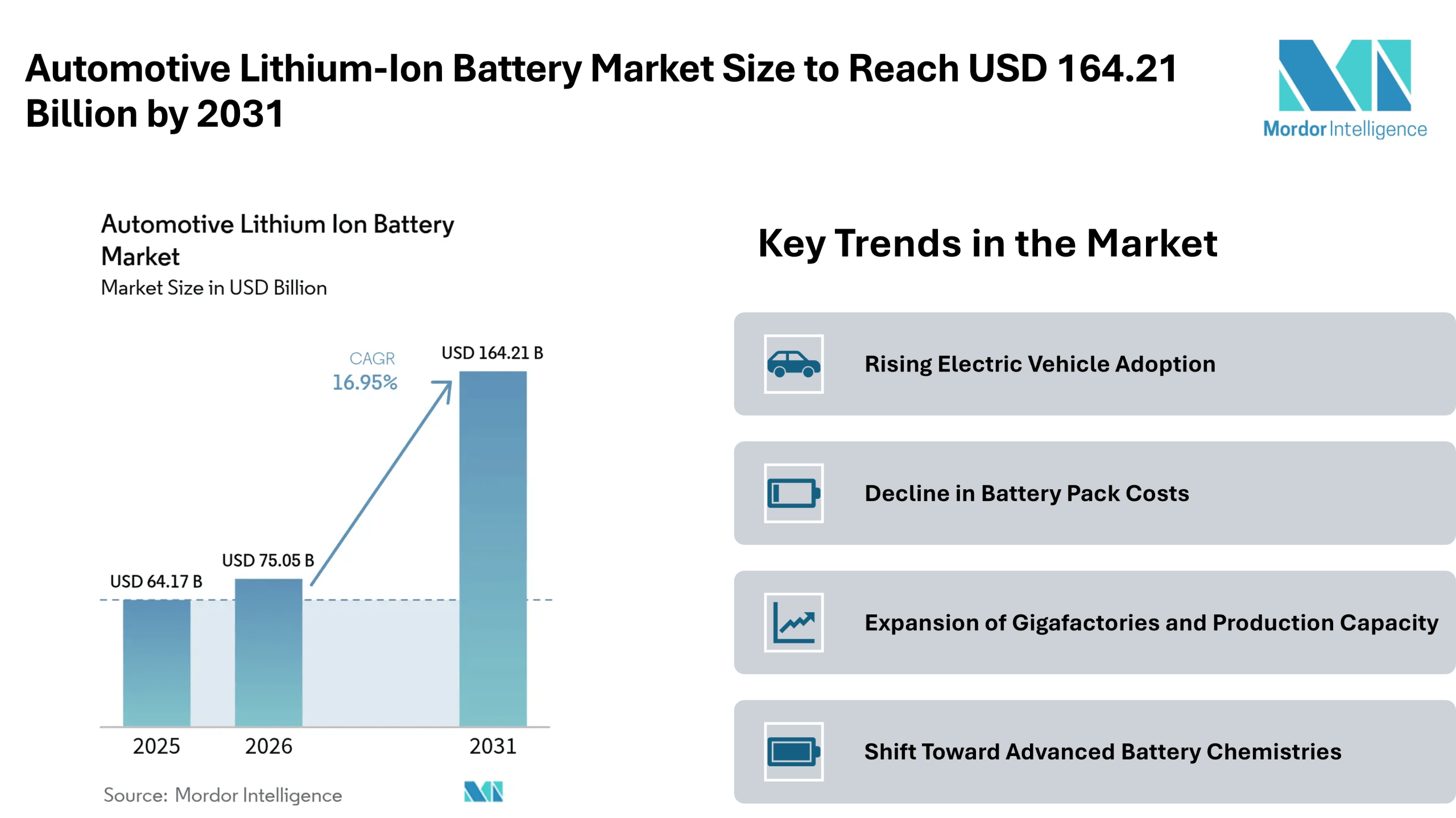 According to Mordor Intelligence, the automotive lithium-ion battery market size is estimated at USD 75.05 billion in 2026, growing from USD 64.17 billion in 2025, and is projected to reach USD 164.21 billion by 2031 at a CAGR of 16.95%. This automotive lithium-ion battery market growth is closely tied to increasing electric vehicle adoption, stricter emission regulations, and ongoing improvements in battery cost and efficiency.