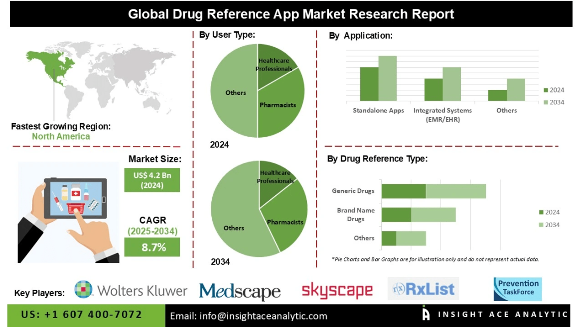 InsightAce Analytic Pvt. Ltd. announces the release of a market assessment report on theGlobal Drug Reference App Market Size, Share & Trends Analysis Report By User Type (Healthcare Professionals, Pharmacists, Nurses, Researchers, Medical Students, Patients & Caregivers), By Application Type (Standalone Apps, Integrated Systems (EMR/EHR), Web-Based Applications, Mobile Applications (IOS And Android), and Desktop Applications), By Drug Reference Type (Brand Name Drugs, Generic Drugs, OTC (Over The Counter) Drugs, Herbal Supplements, and Controlled Substances) By Functionality (Drug Interaction Checking, Dosage Information, Side Effects And Warnings, Patient Information Leaflets, and Medication Management Tools), By Pricing Model (Free Apps, Subscription-Based Models, One-Time Purchase Apps, Freemium Models (Free With In-App Purchases), and Enterprise Licensing For Organizations)-Market Outlook And Industry Analysis 2034″