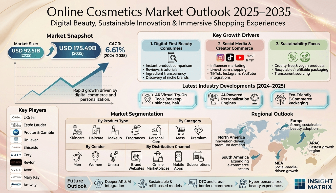 The Online Cosmetics Market has experienced significant growth in recent years as digital transformation reshapes how consumers purchase beauty products. With the rise of e-commerce platforms, mobile shopping, and social media influence, cosmetic brands are increasingly shifting their sales strategies toward online channels. According to industry projections, the Online Cosmetics Market size is expected to reach USD 92.51 billion in 2025 and grow to USD 175.49 billion by 2035, registering a compound annual growth rate (CAGR) of 6.61% during the forecast period from 2025 to 2035. The market analysis includes revenue forecasts, competitive landscape evaluation, key growth drivers, and emerging trends shaping the digital beauty ecosystem.