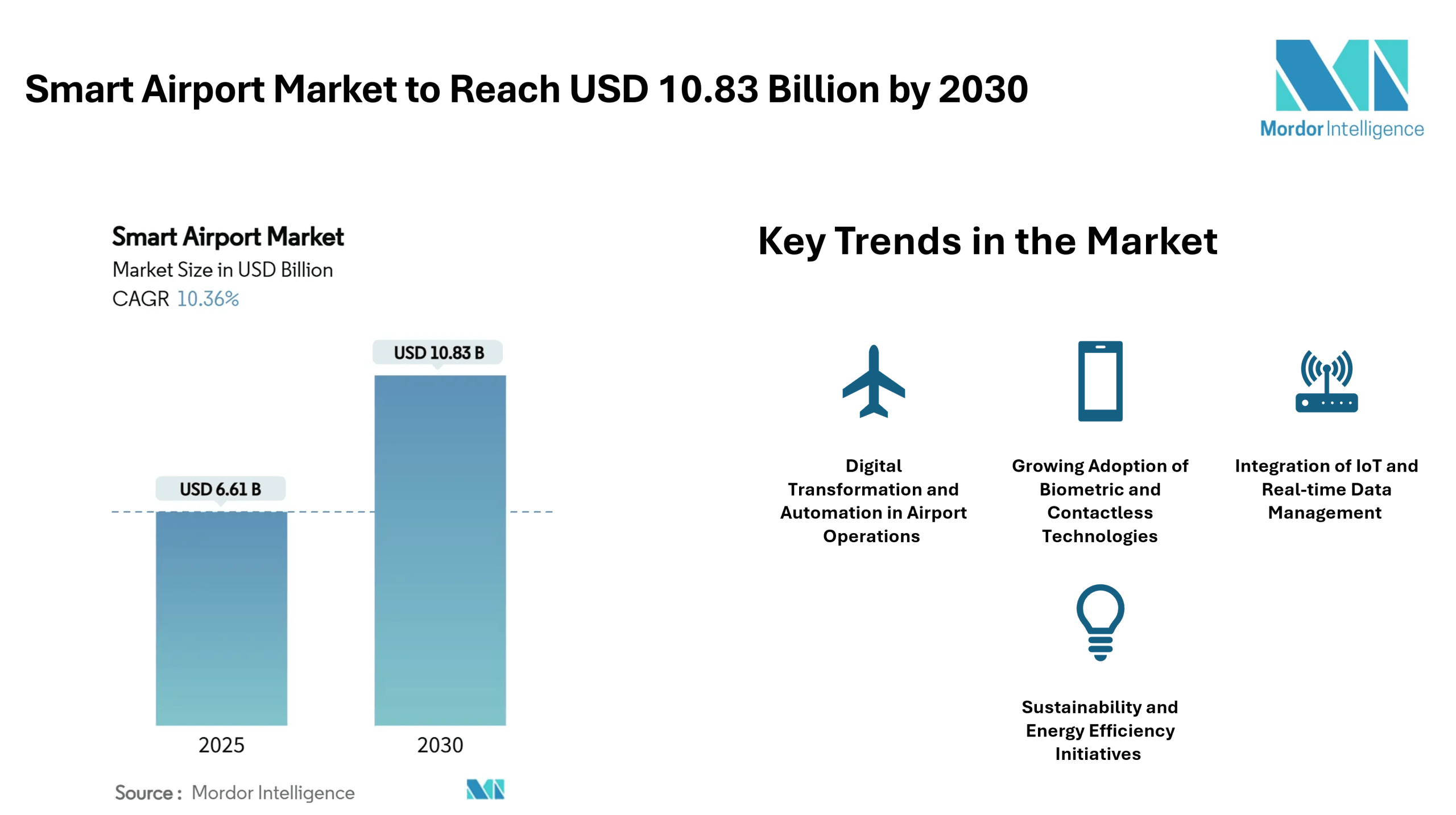 The smart airport market reached USD 6.61 billion in 2025 and is forecasted to reach USD 10.83 billion by 2030, advancing at a 10.36% CAGR. Growing passenger traffic, tighter security mandates, and the need for real-time operational visibility prompt airports to accelerate digital transformation. This growth is driven by the increasing emphasis on seamless passenger experience, operational efficiency, and the adoption of data-driven airport management systems. The demand for advanced airport solutions integrating IoT, AI, biometric verification, and automated systems is expanding across both developed and emerging regions.