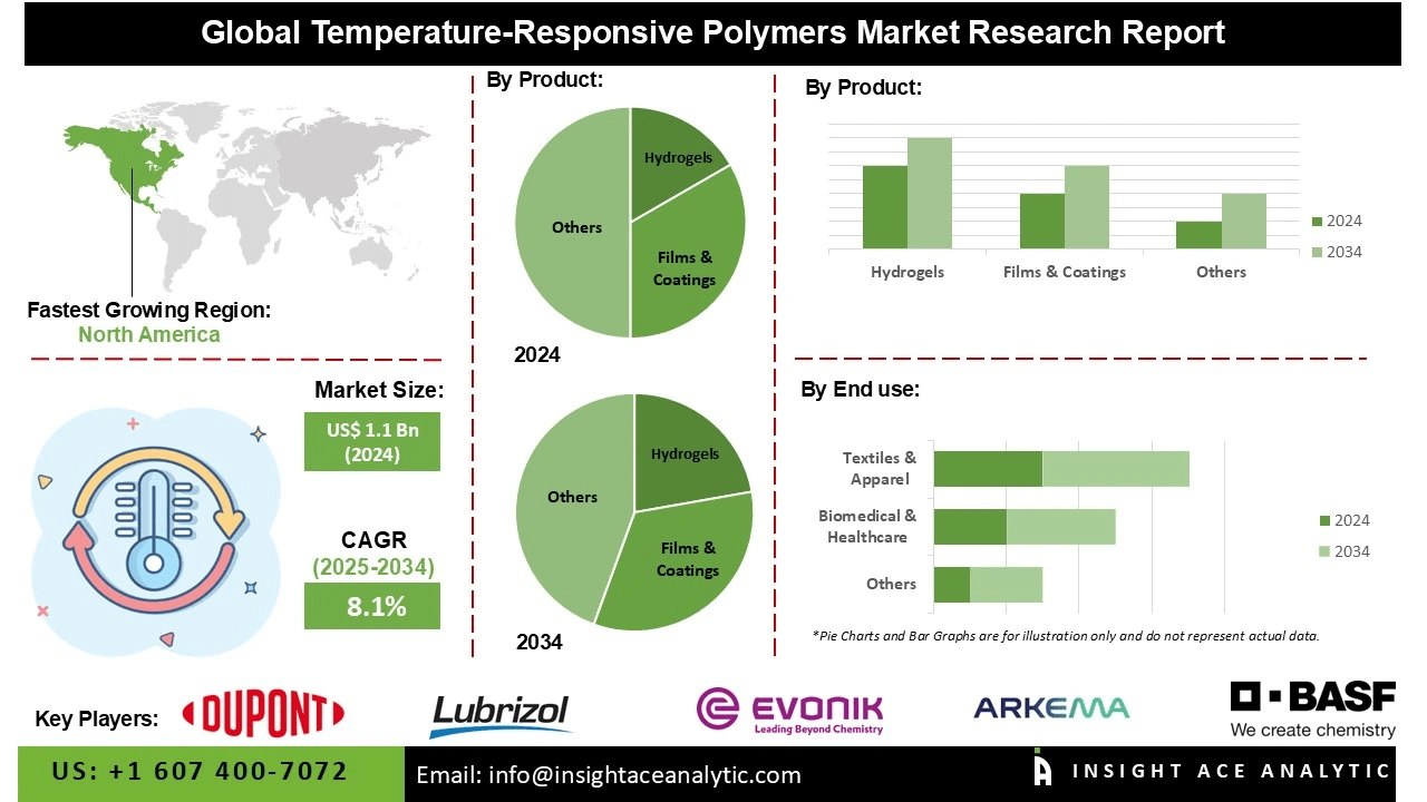 InsightAce Analytic Pvt. Ltd. announces the release of a market assessment report on theGlobal Temperature-Responsive Polymers Market Size, Share & Trends Analysis Report, By Product (Hydrogels, Films & Coatings, Fibers & Textiles, Additives & Blends, and Shape-Memory Components), By End Use (Biomedical & Healthcare, Textiles & Apparel, Automotive & Aerospace, Electronics & Consumer Goods, and Packaging & Food),-Market Outlook And Industry Analysis 2034″